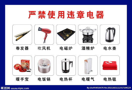 一、学生公寓防火。在宿舍,同学们应自觉遵守宿舍安全管理规定,做到不私拉、乱拉、乱接电线;不使用电炉、电热杯、热得快、电饭煲、电热毯等电热器具;使用台灯、充电器、电脑等电器要注意发热部位的散热;室内无人时,应关掉电器的电源开关并且拔下插头;不要躺在床上吸烟或乱扔烟头,不点蚊香;不在宿舍存放和使用蜡烛,不在宿舍内存放汽油、酒精等易燃易爆物品,不得在宿舍使用汽油、酒精炉等明火和焚烧物品,不在疏散通道堆放杂物。