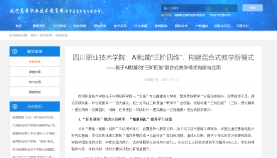 同时以《四川职业技术学院:AI赋能“三阶四维”,构建混合式教学新模式——基于AI赋能的“三阶四维”混合式教学模式构建与应用》为题在现代高等职业技术网(原中国高职高专教育网)、中国教育在线发表文章,围绕“三阶:理论精讲-虚拟预练-实操强化,四维:任务进阶-双线并行-虚实融合-过程画像”报道了我校电子与物联网学院在深入开展课程改革,构建混合式教学新模式方面的实践成果。