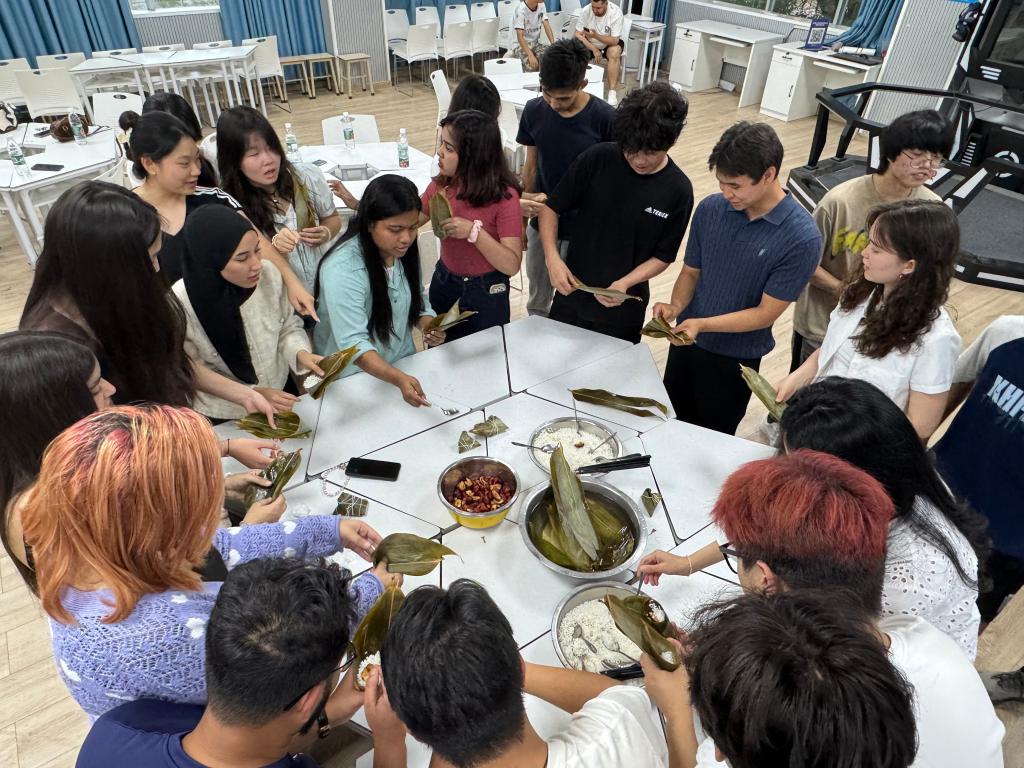 巧手裹粽传心意,重头戏包粽子环节将活动气氛推向高潮。翠绿粽叶、莹白糯米、金黄蜜枣在长桌铺开,智能建造学院的“小导师”们分组示范:折叶成兜、填米压实、缠绕棉线……外国校友们兴致盎然,纷纷动手尝试。当一个个饱含心意的粽子在掌心诞生,文化隔阂悄然消融,唯有粽香与笑语交织流淌。