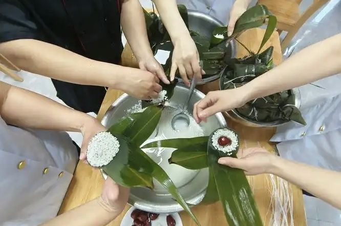 理论浸润后,大家围聚在摆满食材的桌旁,开展了一场别开生面的“迎端午·包粽子”体验活动。大家兴致勃勃,从粽叶折叠、馅料填充,到仔细捆扎,每个步骤都亲力亲为、动手实践。活动现场欢声笑语此起彼伏,粽叶飘香,洋溢着欢乐祥和的节日气氛。