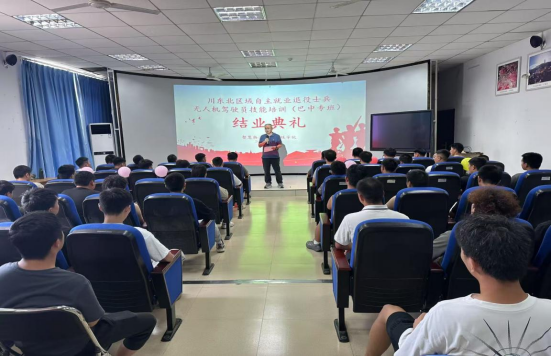 经过为期4周紧张而充实的培训学习,川东北区域(巴中)2025年自主就业退役士兵无人机驾驶员技能培训专班于6月27日在四川职业技术学院隆重举行结业仪式。90名学员完成全部课程并通过考核顺利结业,即将成为无人机应用领域的新生力量,为低空经济发展注入新动能。