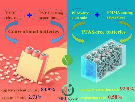 全氟和多氟烷基物质(简称“PFAS”)具有生物蓄积性和毒性。此背景下,开发高性能PFAS替代品已成为锂离子电池技术可持续发展的当务之急。为此,研究团队提出一种PAN/PMMA体系协同机制,即利用商用聚丙烯腈(简称“PAN”)粘结剂和聚甲基丙烯酸甲酯(简称“PMMA”)涂层隔膜替代锂离子电池制作过程中使用的含氟粘结剂和含氟涂层隔膜,构建绿色环保的无氟电池(简称“PFBs”)。