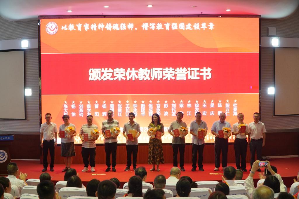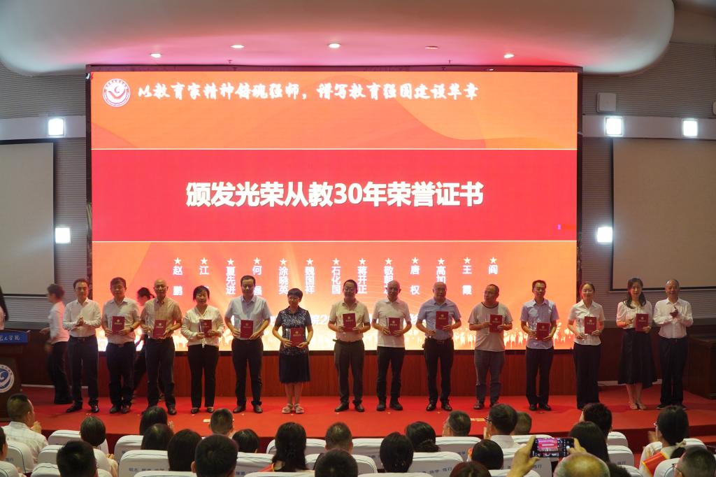 大会为从教40年、35年、30年的教师颁发荣誉证书,表彰他们数十载如一日的育人奉献。荣休仪式上,退休教师接受鲜花与致敬,工龄30年教师代表也依次上台领奖,现场掌声不息,致敬着他们“择一事、终一生”的坚守精神。随后,党委副书记、校长黄远新宣读年度“优秀教师”“优秀教育工作者”表彰决定,校领导为表彰对象送上鲜花并颁发荣誉证书。