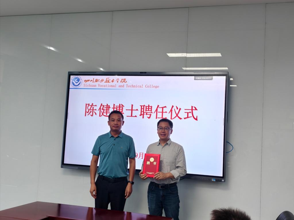 9月12日上午,我校在龙凤校区B2-511会议室举行陈健博士聘任仪式,党委副书记胥长寿同志出席聘任仪式并为陈健博士颁发聘书,正式聘任其担任副院长并主持行政工作。会议由党委组织部副部长贺桂祯主持。