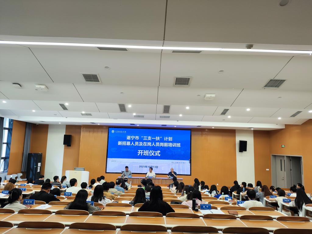 10月13日,遂宁市2025度“三支一扶”招募计划人员岗前培训暨在岗培训开班仪式在我校龙凤产学研园区举行。我校党委委员、副校长杨浩,遂宁市委农办副主任、市农业农村局党组成员赵汝义出席会议。校党政办主任郭鹏主持开班仪式。