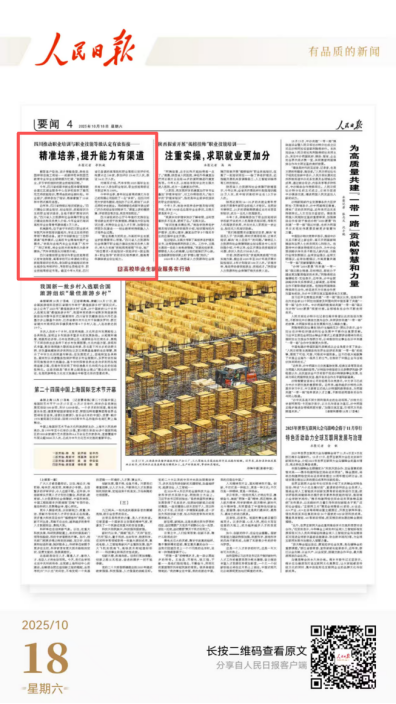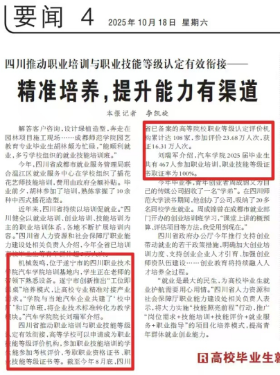 10月18日,《人民日报》“要闻版”以《四川推动职业培训与职业技能等级认定有效衔接——精准培养,提升能力有渠道》为题,专题报道了四川省在补贴性职业技能培训和技能评价工作方面的创新实践与显著成效。其中,我校职业技能培训工作作为典型案例被重点收录,充分展现了我校在产教融合、技能育人领域的扎实举措与突出成果。