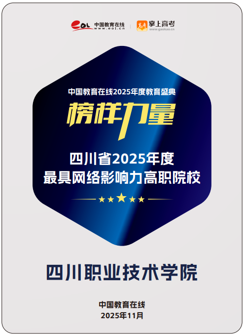 近日,中国教育在线主办的“榜样力量・2025 年度教育盛典” 正式公布优秀案例评选结果。我校凭借兼具创新性与前瞻性的招生宣传体系,以及扎实高效的宣传执行能力,在全国众多参评高校中脱颖而出,成功获评“四川省 2025 年度最具网络影响力高职院校” 荣誉称号。这是学校继 2024 年首次获评“四川省2024 年度最具网络影响力高职院校”后,再次获此认可,实现连续连续两年获此荣誉。