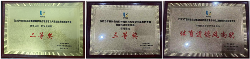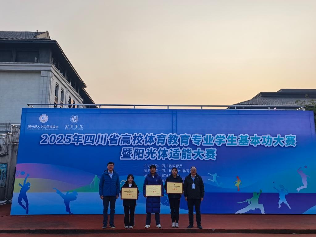 11月27日,由四川省教育厅主办的2025年四川省高校体育教育专业学生基本功大赛暨阳光体适能大赛于宜宾学院圆满落幕。本次赛事吸引了全省38所高校的500余名师生参与,全方位检验了体育教育专业学生的技能素养以及普通学生的体质健康状况。在省教育厅进行随机抽测的情况下,我校体育教学部选派数字媒体学院2024级刘一贤、沈志斌、邓熠、吉俄伍铁、曾玉、范丹丹、李至怡、王艺兴八名学生组成代表队参赛。该代表队在教练专业指导下,于赛场上表现出色,最终荣获阳光体适能大赛团体总分二等奖。2024级体育教育专业的吉呈、邹文旭、龚兴权、马骐骥4名学生凭借扎实的专业功底,荣获体育教育专业学生基本功大赛团体基础理论三等奖;吉呈获个人全能二等奖;龚兴权获个人全能三等奖、篮球技能三等奖。此外,代表队还获得“体育道德风尚奖”。这充分彰显了我校体育育人体系的坚实基础与显著成效。